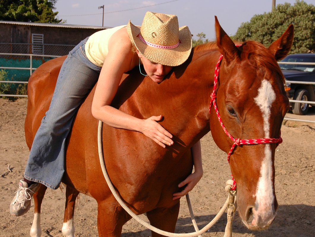 I was horrified. I didn’t even know that such a thing as “setting back” existed, and I didn’t know what to do. I froze, and then sidled up to him carefully, fully expecting another explosion. I placed my hand on his neck, speaking softly. He stiffened his skinny neck, holding it stiff and high, almost perpendicular to his ridiculously high withers. I continued talking softly, giving him a chance to think. He stared at me with bright glassy eyes for a few moments, then licked and chewed, dropped his head, and pressed his forehead flat against my chest. My first horse hug. “Fix it,” he seemed to be saying.