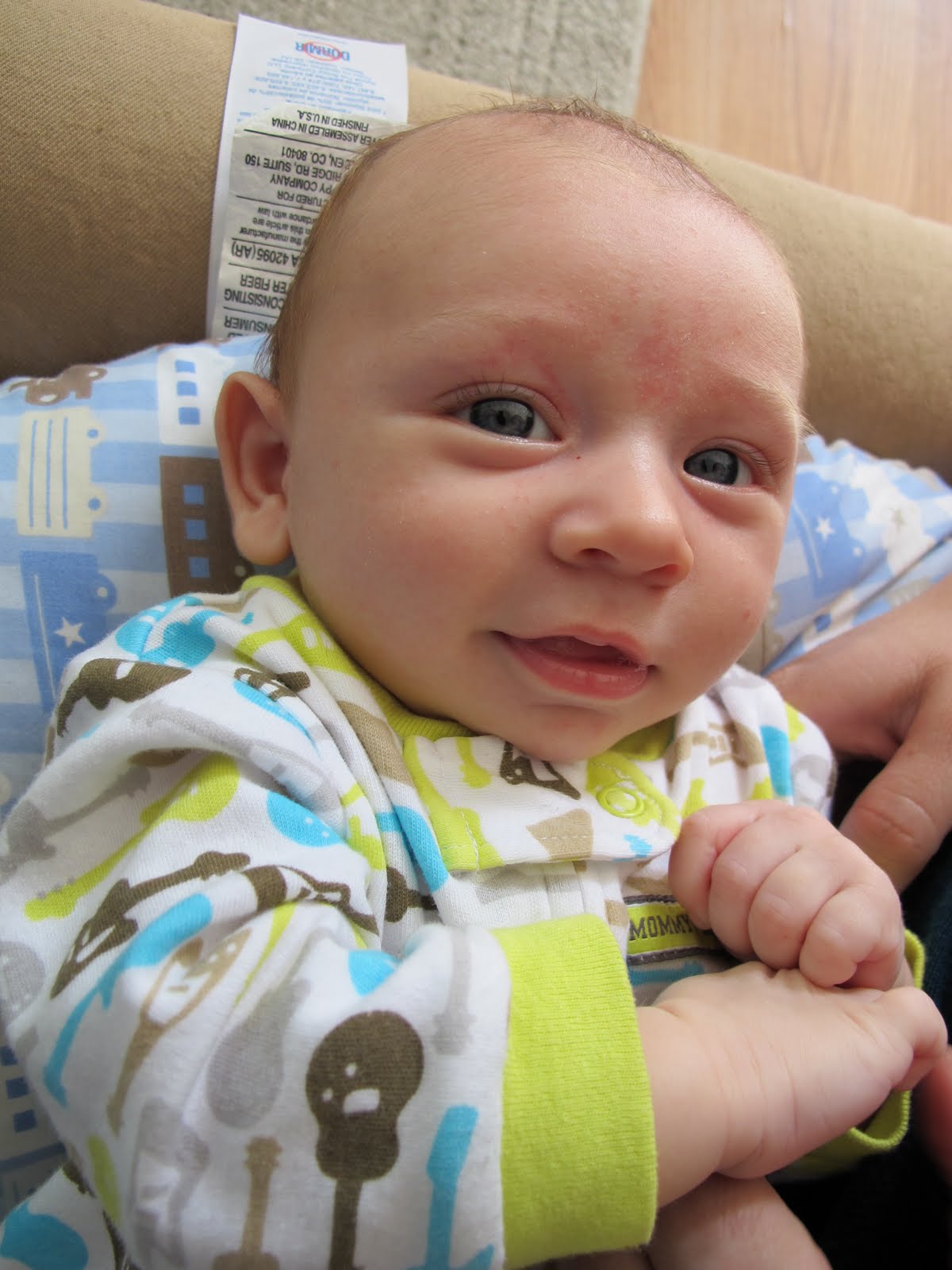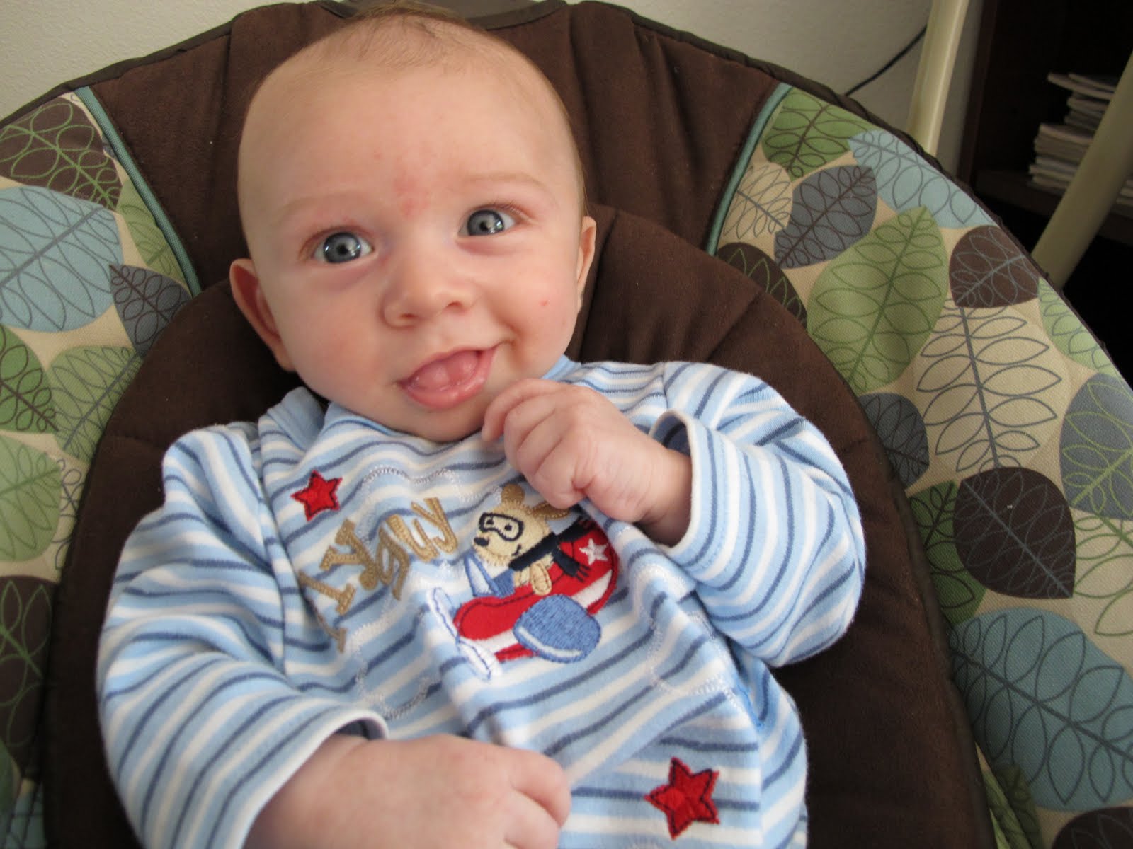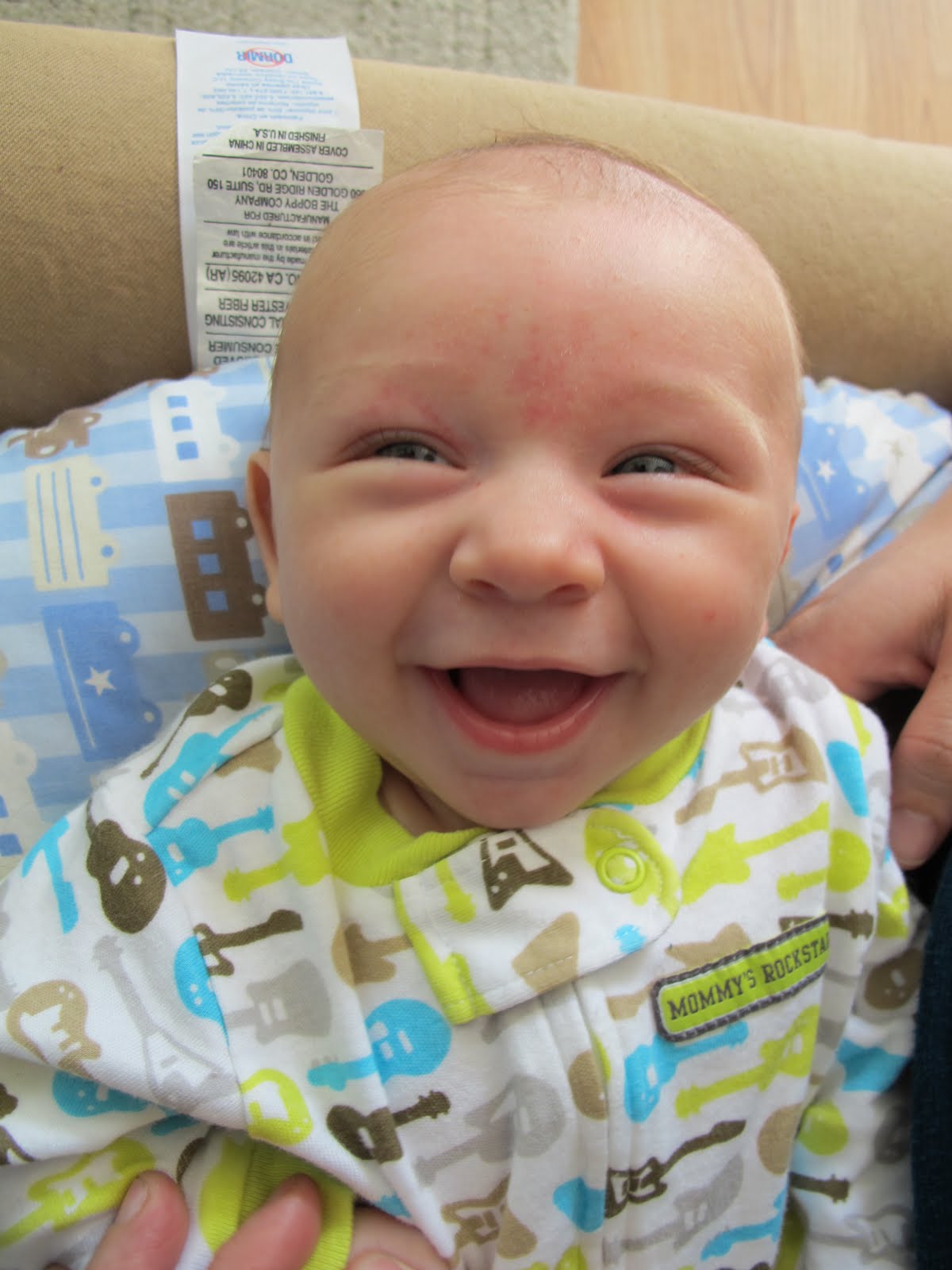 It doesn’t take much to make him happy. As long as he’s not hungry or wet, he’s happy. In fact, on a regular basis I’ll walk into the room and see him propped up in his swing, laughing his little heart out.