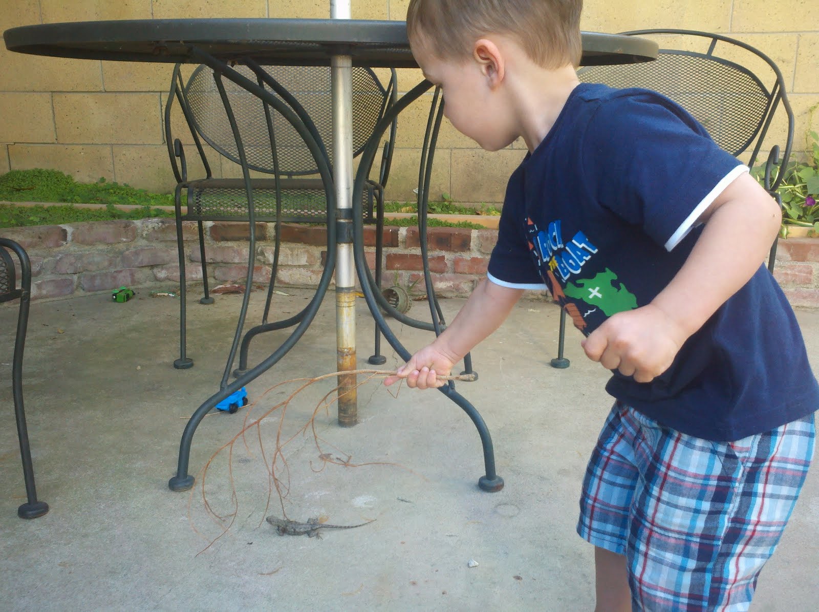 No, Matty. Don’t just squat there and wave the stick at it. The ground is cold, and lizards are cold blooded. As such, when their blood has cooled they tend to be more sluggish— Oh. Wait. Never mind. That’s too much information for a two year old.