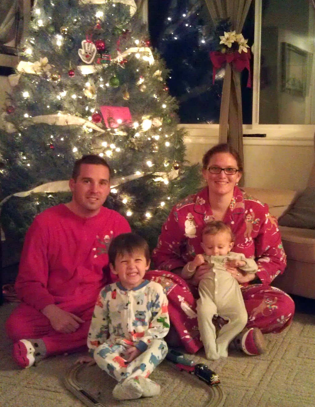 It’s Christmas Eve, the kids are asleep, and the elves brought The Bean and I a pair of matching monkey pajamas. We even got three out of four Beans looking at the camera to document the moment, too. Go, us.